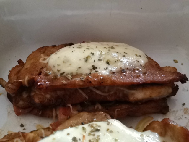 Col·loquem a la safata del forn quatre talls de llom i posem al damunt una miqueta dels pernil barrejat amb el gruyere.