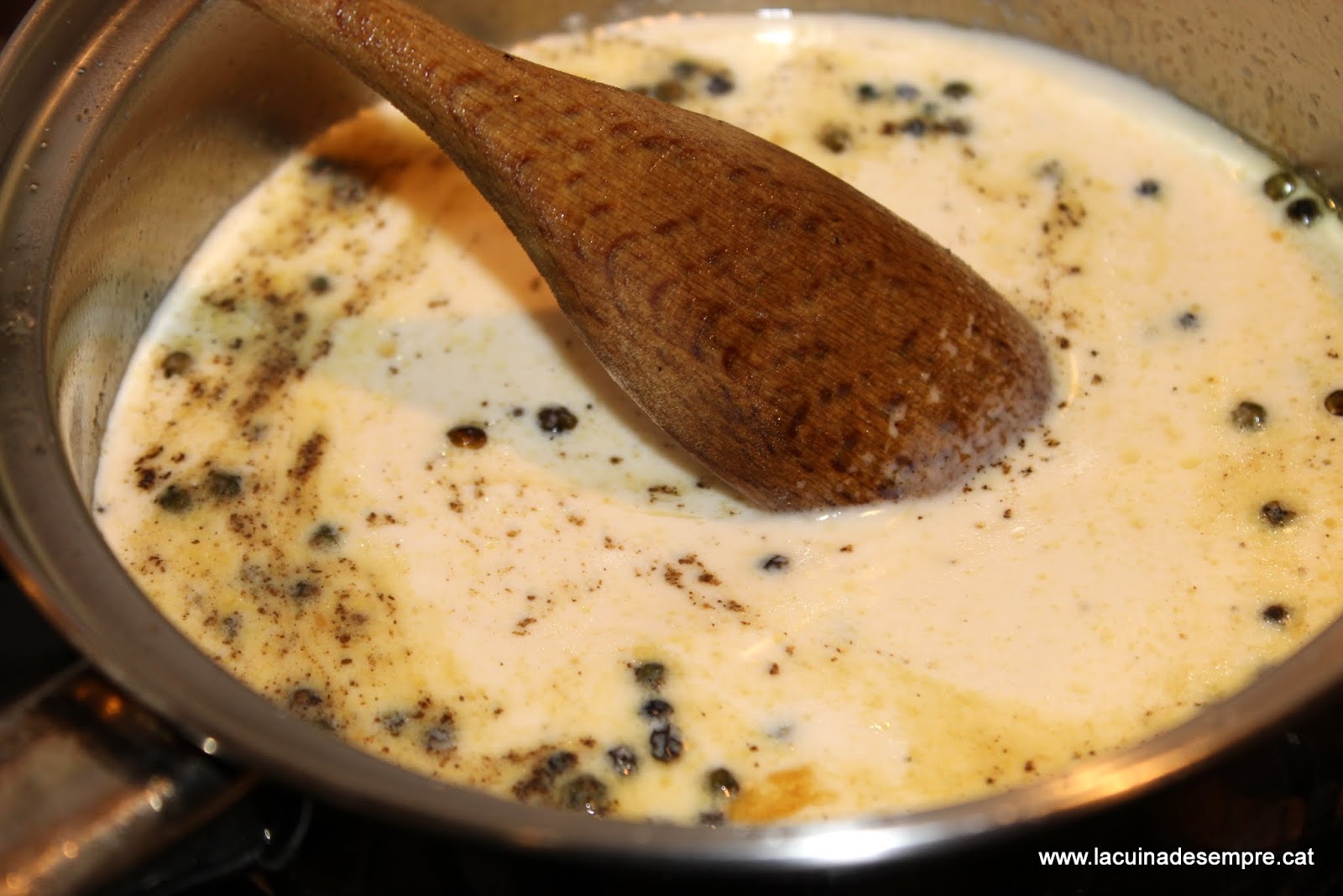 Es deixa reduir una mica i li tirem la nata líquida. Deixem que faci xup-xup fins que la salsa quedi espessa.